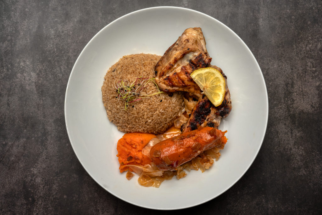 Chicken Love – 19€ (Cuisse de poulet, riz blanc, chou, carotte, tomates cerises, salade verte, avocat)