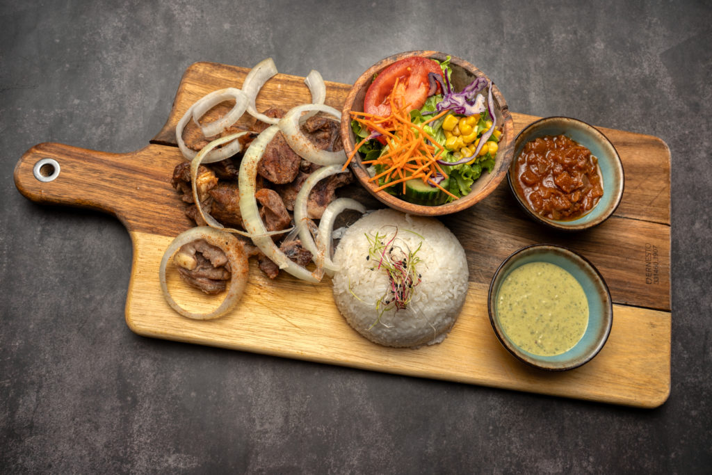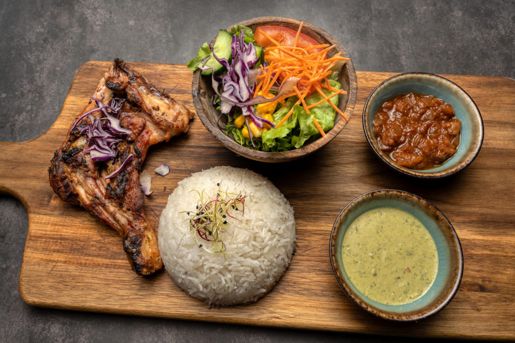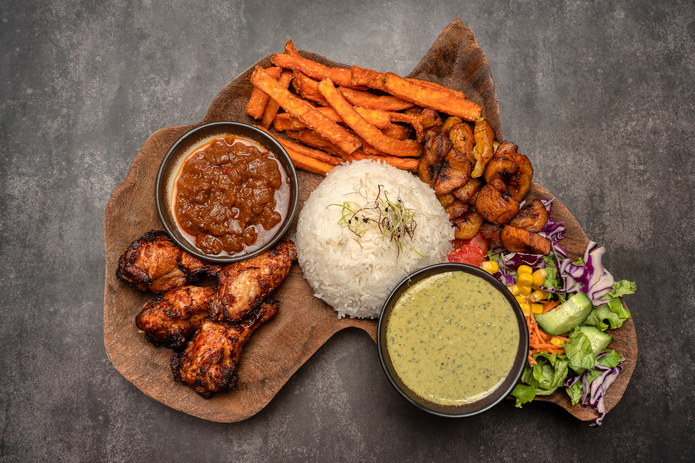 AFRICA IS BEAUTIFUL – 23€ (4 ailes de poulet, riz blanc, frites de patate douce, alloco, salade exotique, sauce rouge et sauce verte)