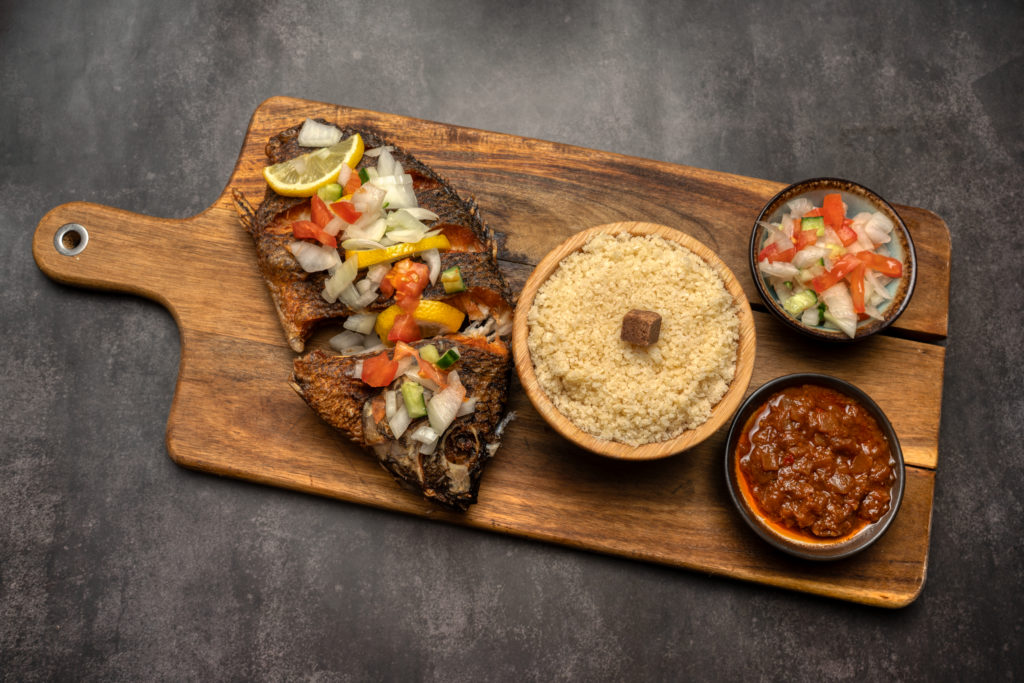 FUTU BANANE AVEC SAUCE GRAINE OU SAUCE MAFE – 24€ (Poulet ou Boeuf)